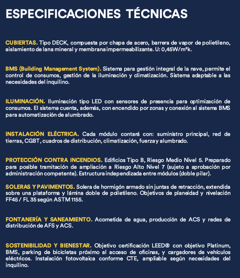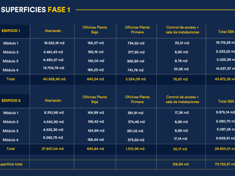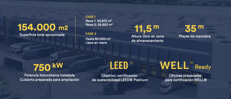 La fase 1 se compone de dos naves modulables para albergar demandas con superficies desde 5.000 m2 hasta 43.000 m2 en un único edificio, ofreciendo gran flexibilidad a sus inquilinos.