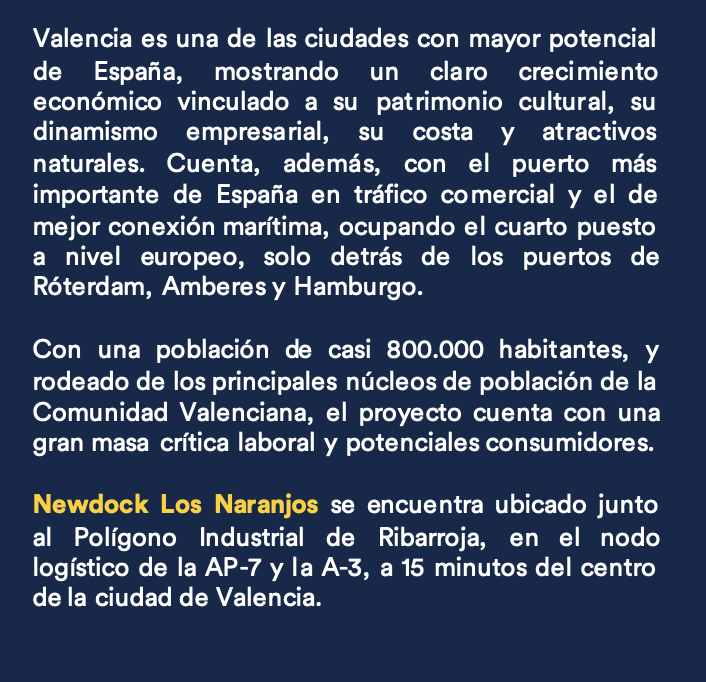 El parque logístico Newdock Los Naranjos se caracteriza por ser el desarrollo con mayor volumen de toda la Comunidad Valenciana, contando con una parcela de más de 250.000 m2